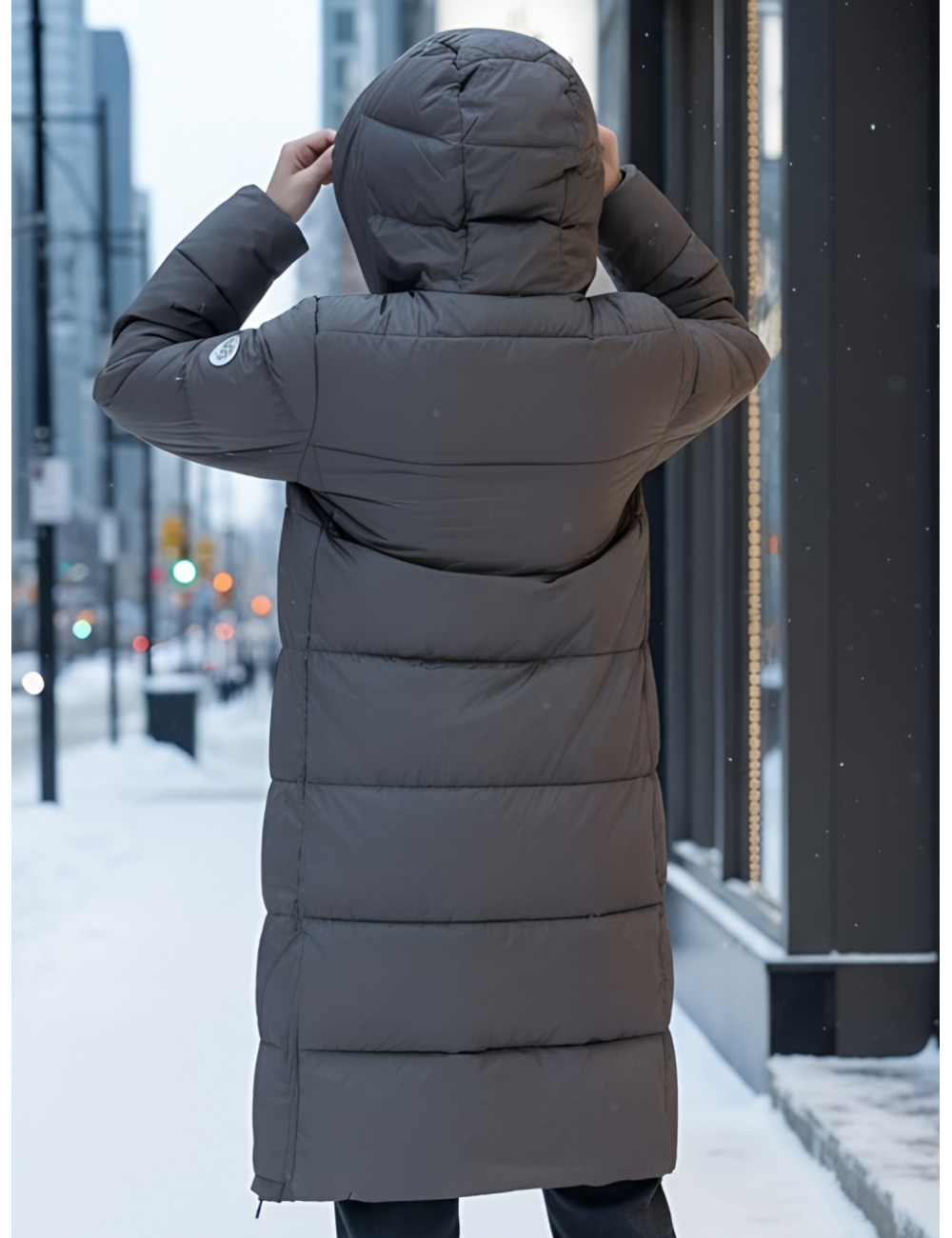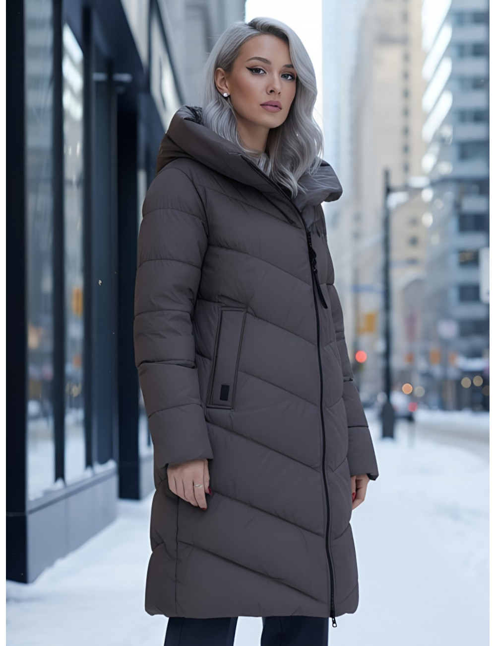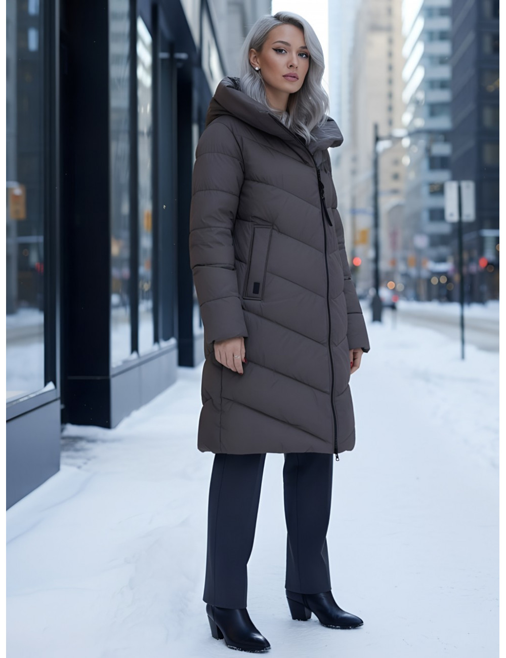 Пуховик доступен в чёрном, хаки, бежевом и тёмно-коричневом цветах. Модель отличается элегантным офисным и повседневным стилем.