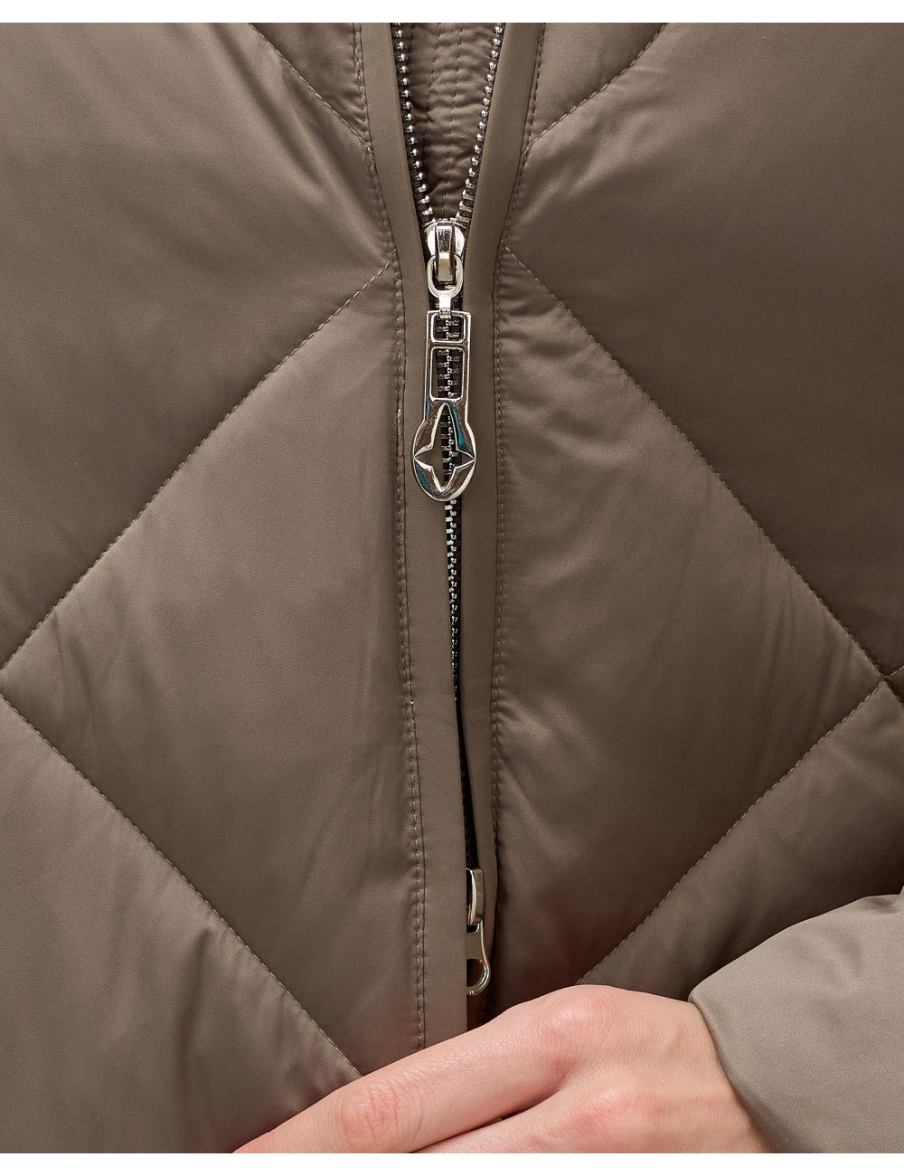 Пуховик доступен в коричневом, чёрном, светло-коричневом и зелёном цветах.