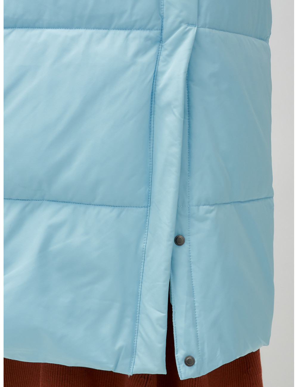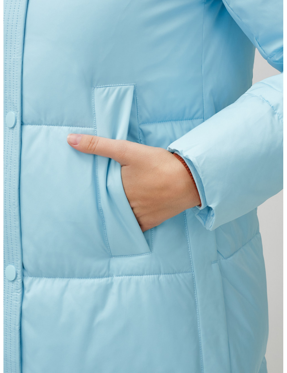 - Функциональность. Боковые прорези на кнопках и утеплённые карманы делают пуховик удобным и практичным.