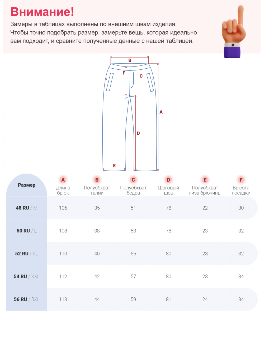 - При выборе размера рекомендуется измерить следующие параметры: длину брюк, полуобхват талии, полуобхват бёдер, шаговый шов, полуобхват низа брючины. Используйте сантиметровую ленту для точности измерений.