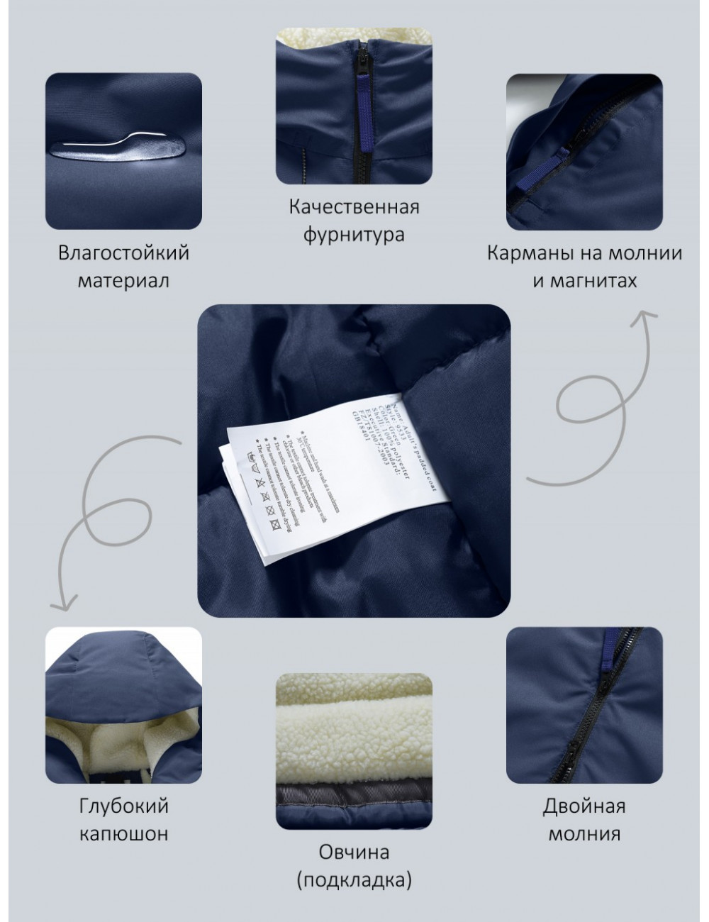 К особенностям модели можно отнести свободный крой, который обеспечивает комфорт и свободу движений, а также водоотталкивающую ткань, которая защищает от ветра и влаги. Утеплитель тинсулейт удерживает тепло даже в сильные морозы, а внутренняя подкладка из овчины, полиэстера и флиса делает парку тёплой и уютной.
