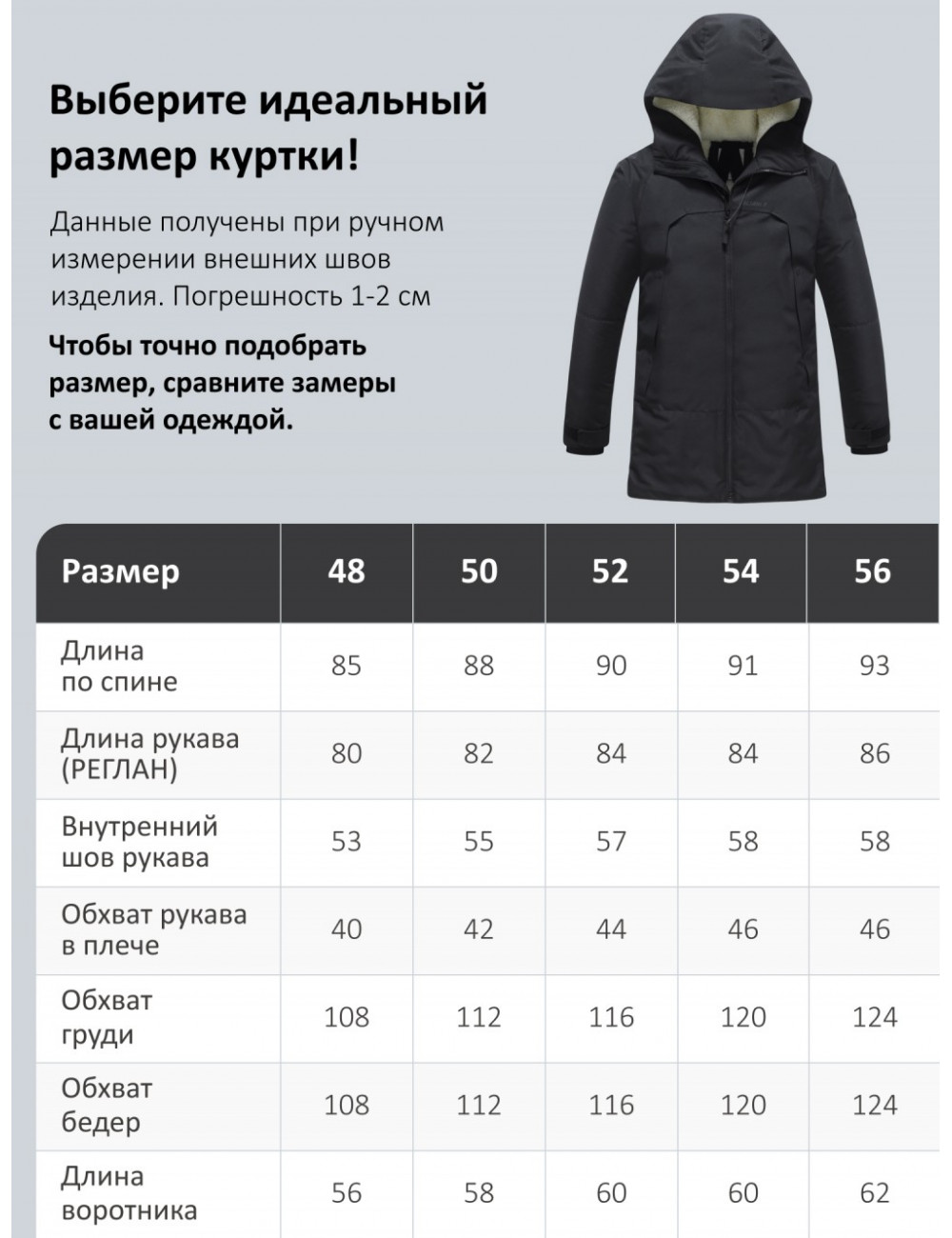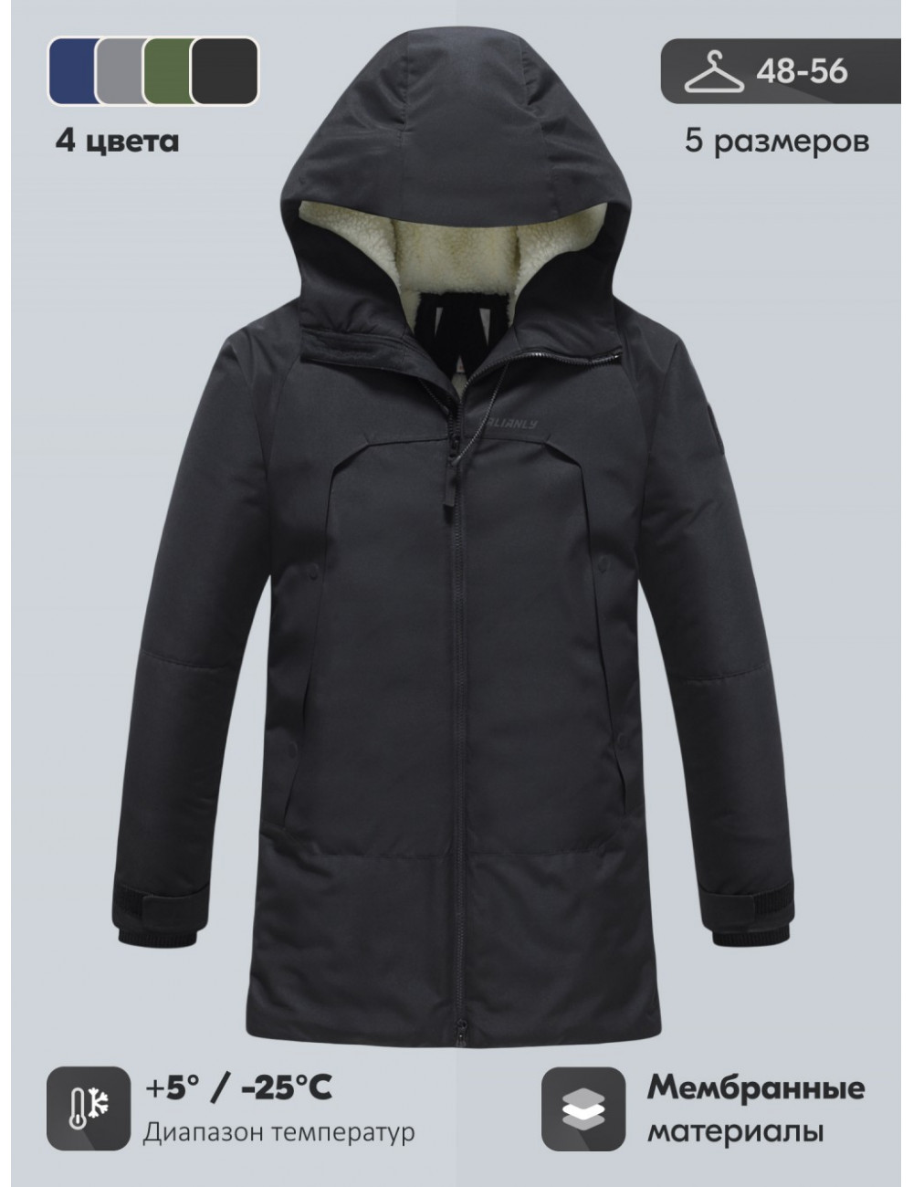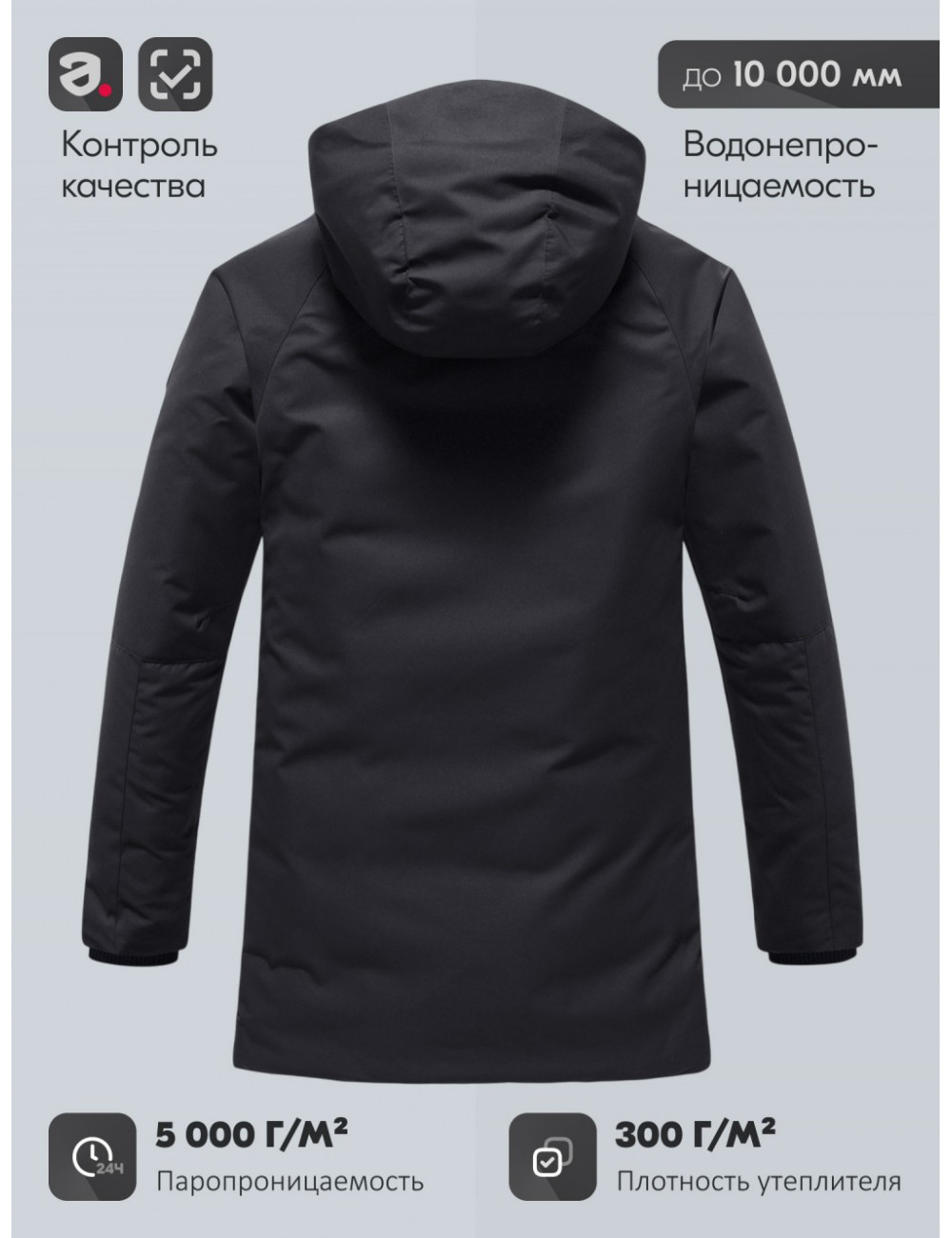 Свободный крой до колена обеспечивает комфорт и свободу движений. Плотная водоотталкивающая ткань с проклеенными швами защищает от ветра и влаги. Утеплитель тинсулейт плотностью 300 г/м² удерживает тепло даже в сильные морозы, оставаясь лёгким и удобным в носке.