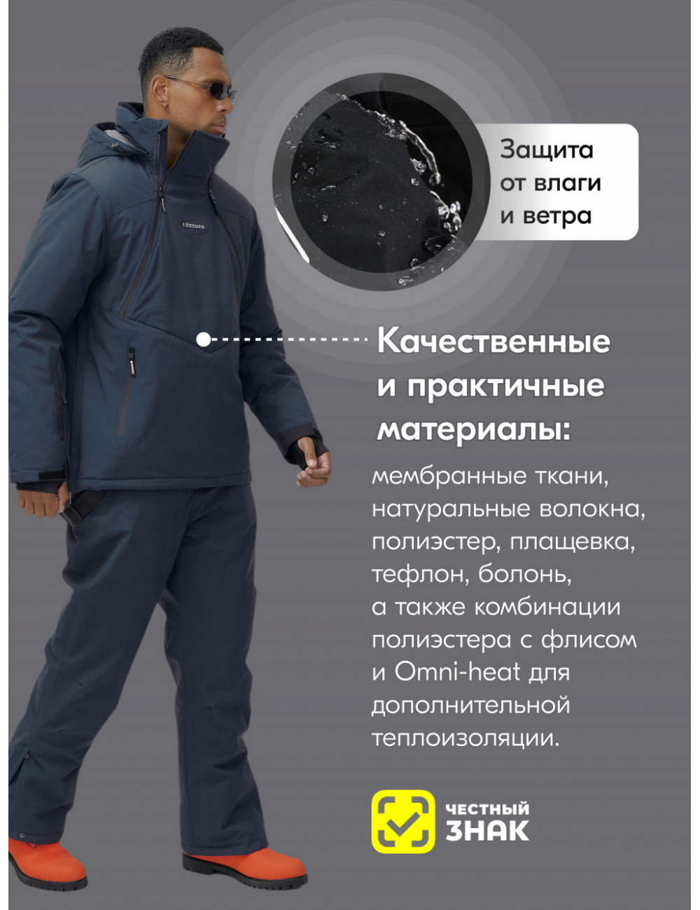Костюм изготовлен из водоотталкивающей мембранной ткани, которая защищает от влаги, а утеплитель из флиса и тинсулейта гарантирует тепло даже в самые холодные дни.