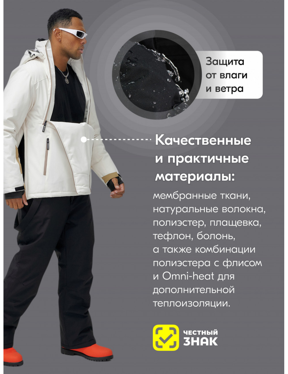 Костюм изготовлен из водоотталкивающей мембранной ткани, которая защищает от влаги, а утеплитель из флиса и тинсулейта гарантирует тепло даже в самые холодные дни.