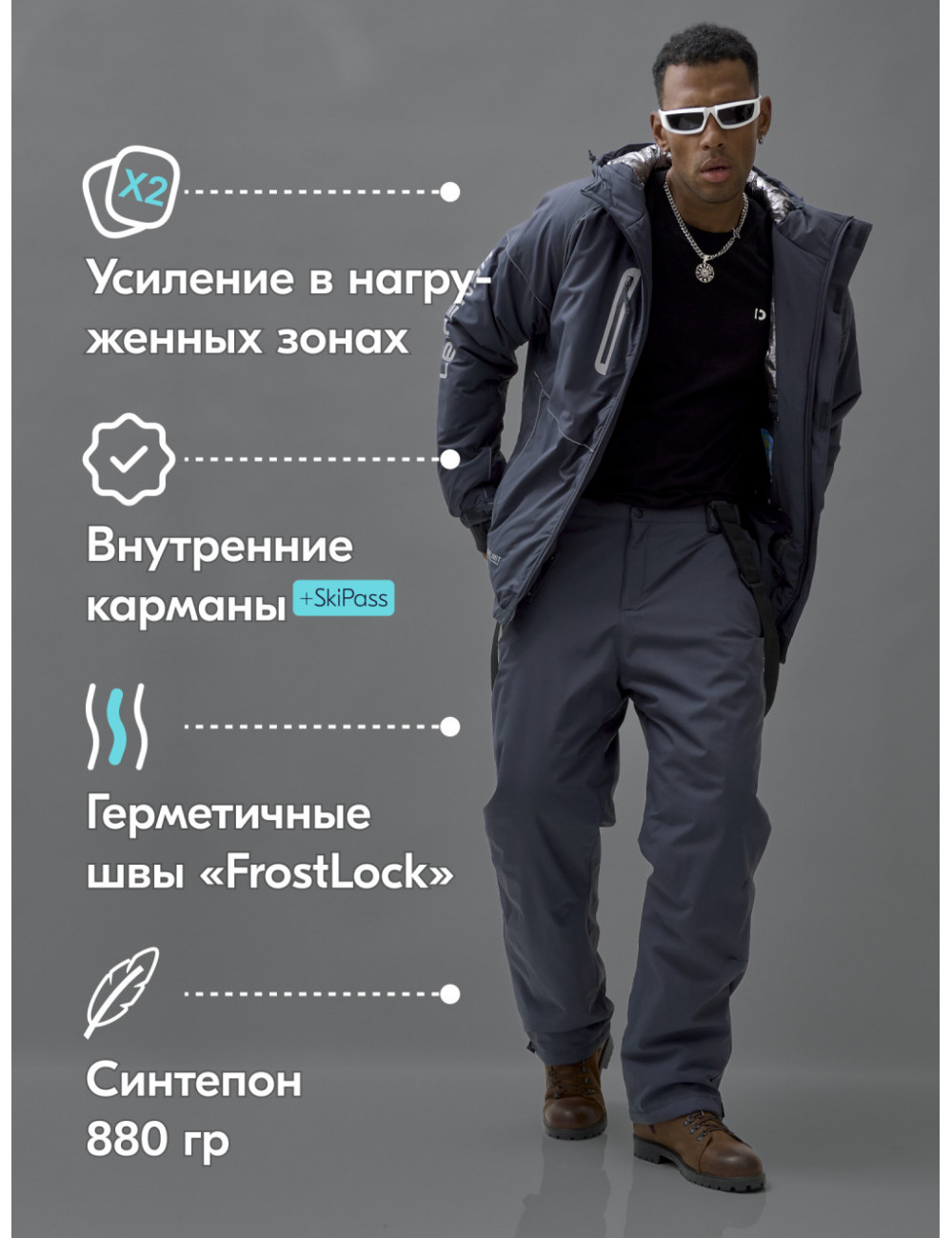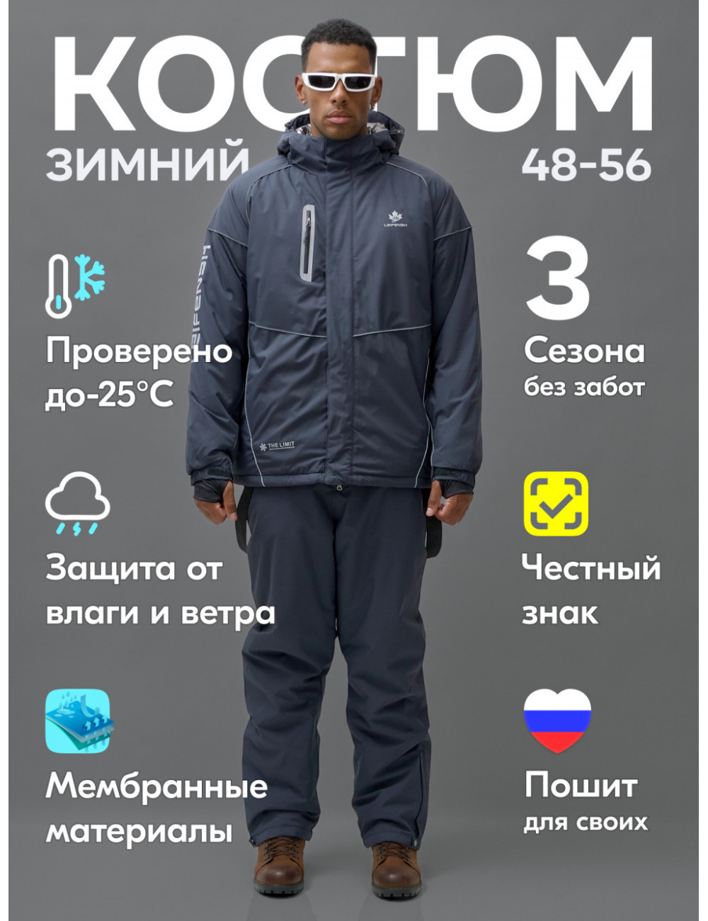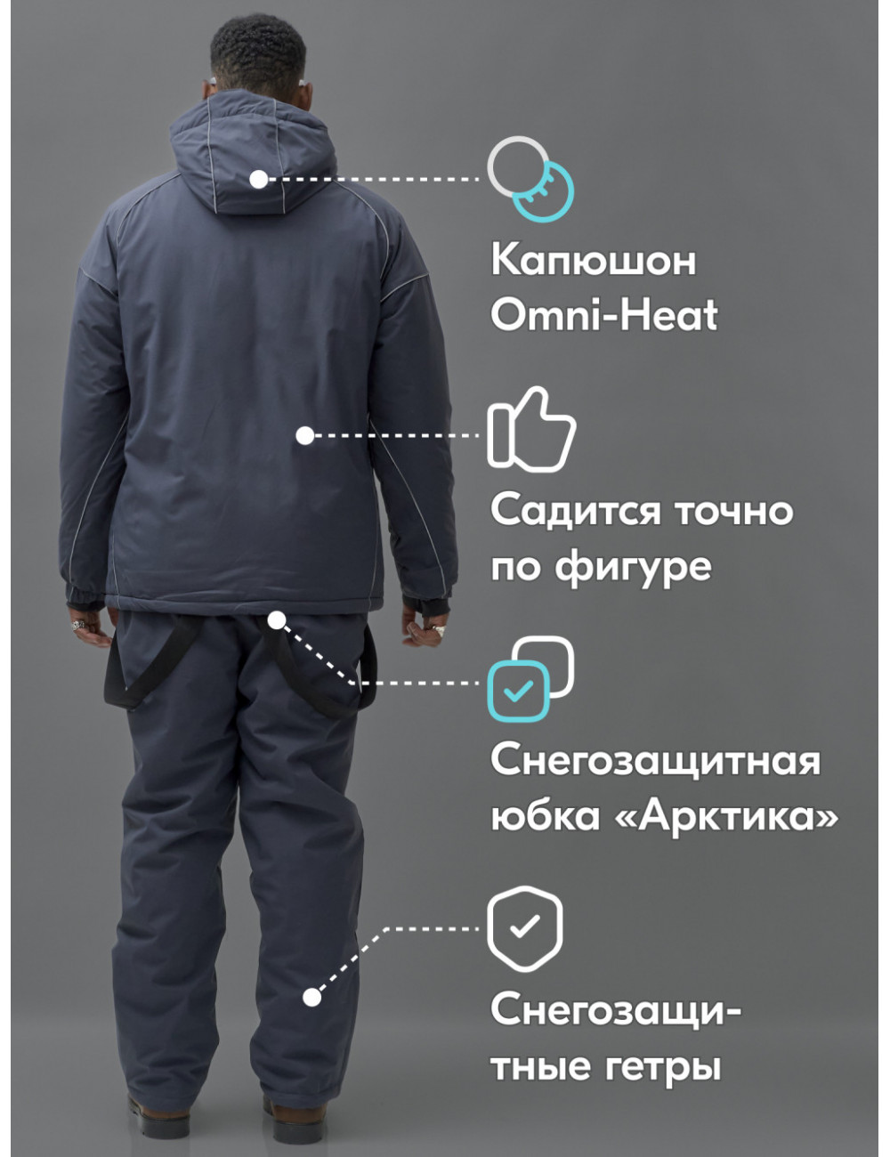 Ответ: костюм обеспечивает защиту от ветра и влаги, комфорт и тепло в холодную погоду, стильный и лаконичный дизайн, удобство использования, надёжность и долговечность.