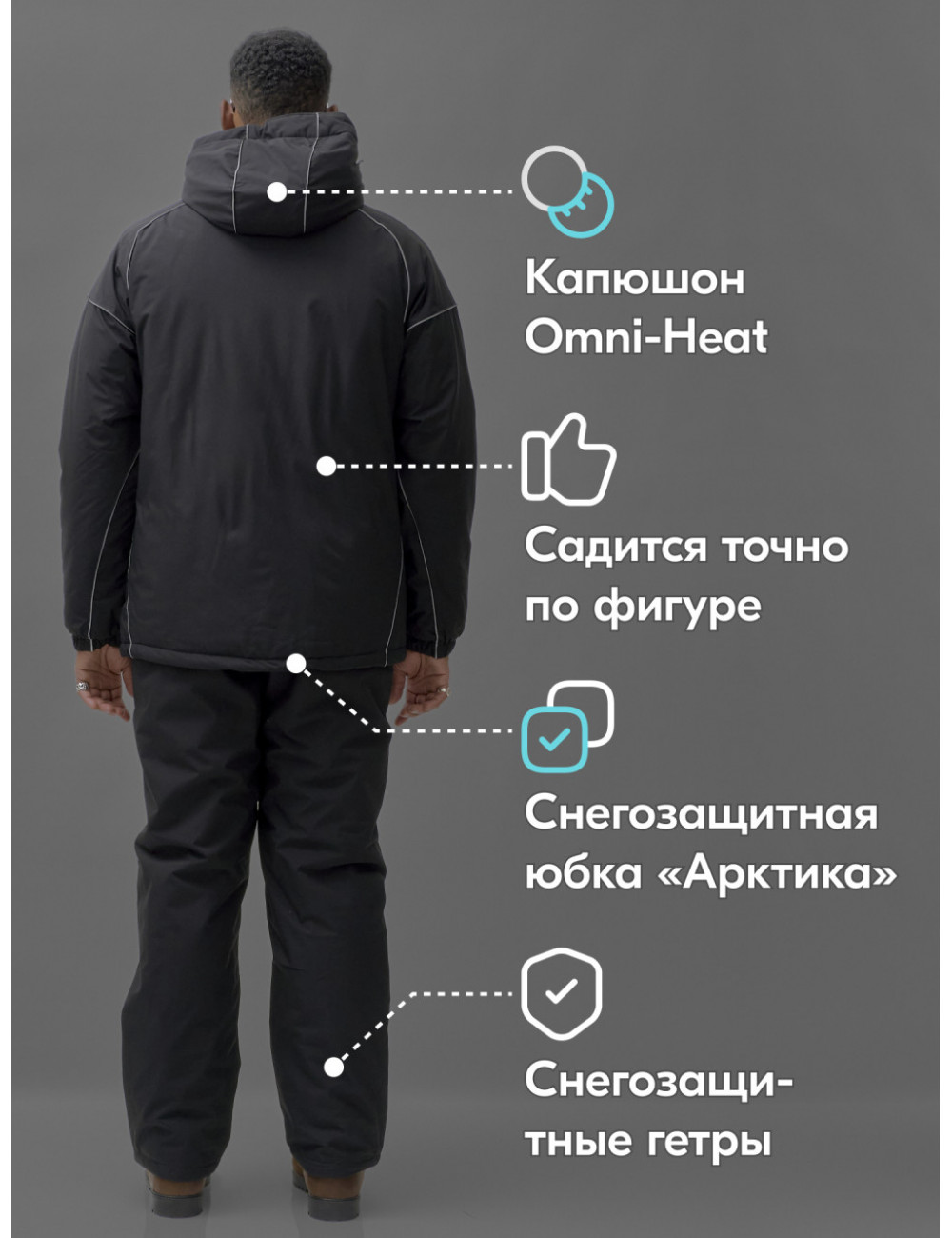 - Функциональность: нагрудные и боковые карманы, ветрозащитная планка, снегозащитные элементы и другие детали делают костюм удобным и практичным.