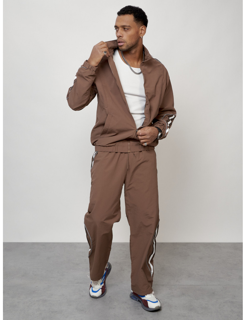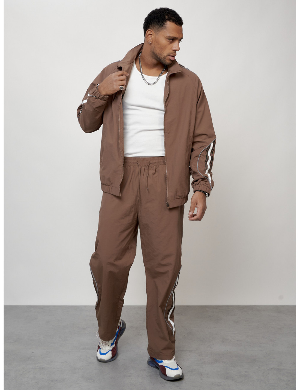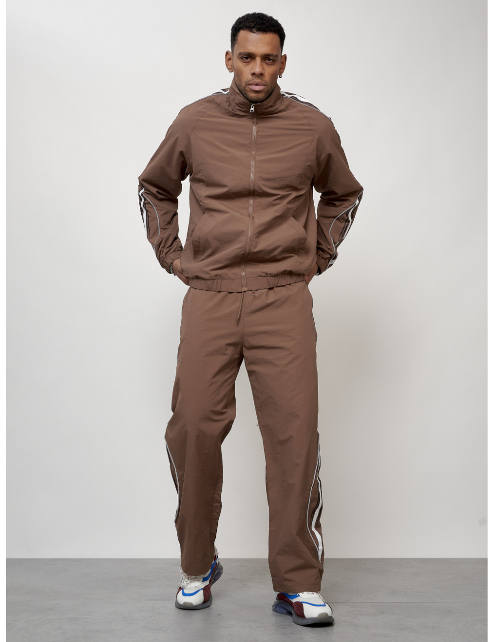 Этот модный костюм состоит из двух частей: олимпийки прямого кроя с воротником-стойкой и брюк из прочного поликристаллического волокна (плащёвка). Материал обеспечивает комфорт при носке и долговечность использования.