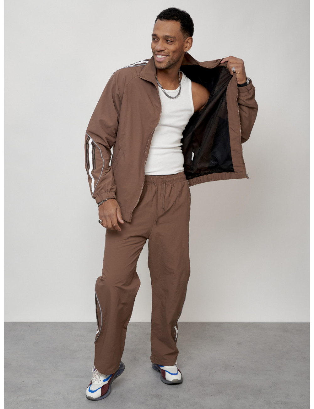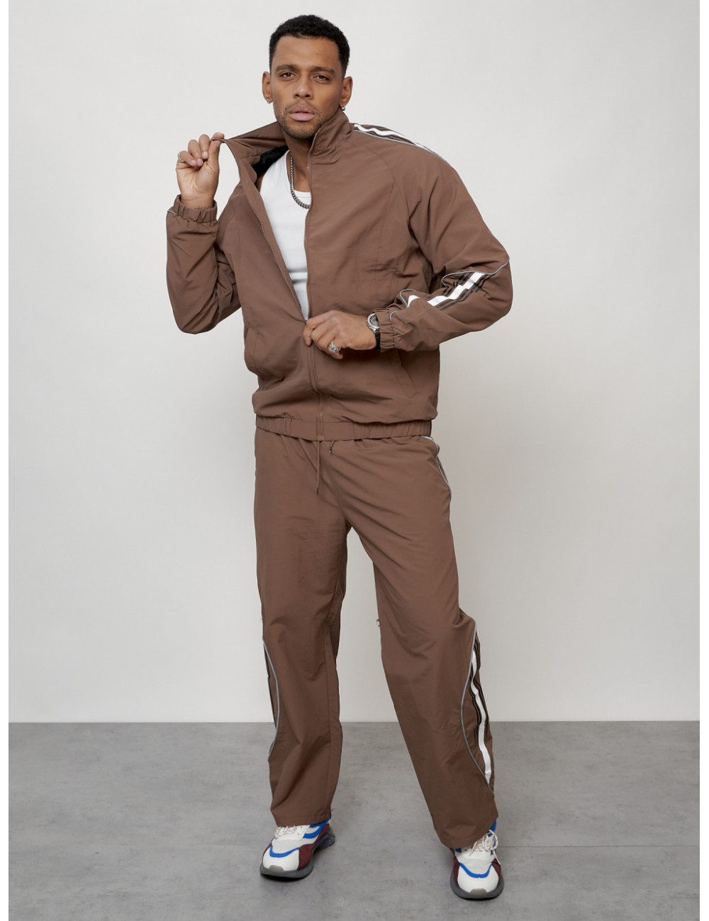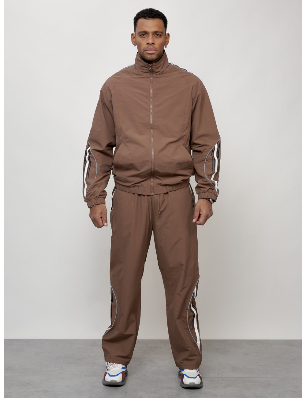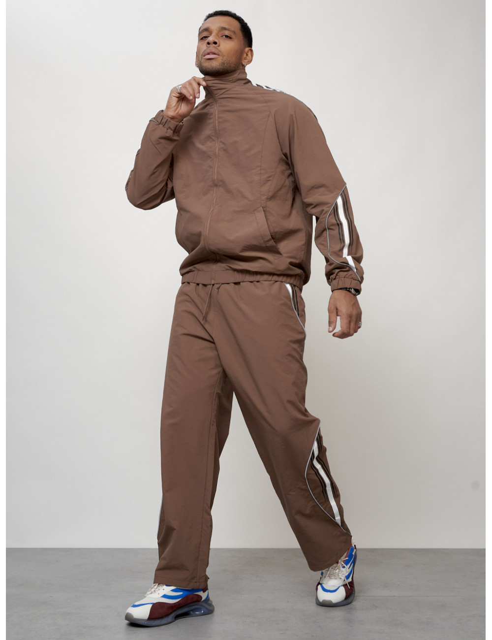 Этот модный костюм состоит из двух частей: олимпийки прямого кроя с воротником-стойкой и брюк из прочного поликристаллического волокна (плащёвка). Материал обеспечивает комфорт при носке и долговечность использования.