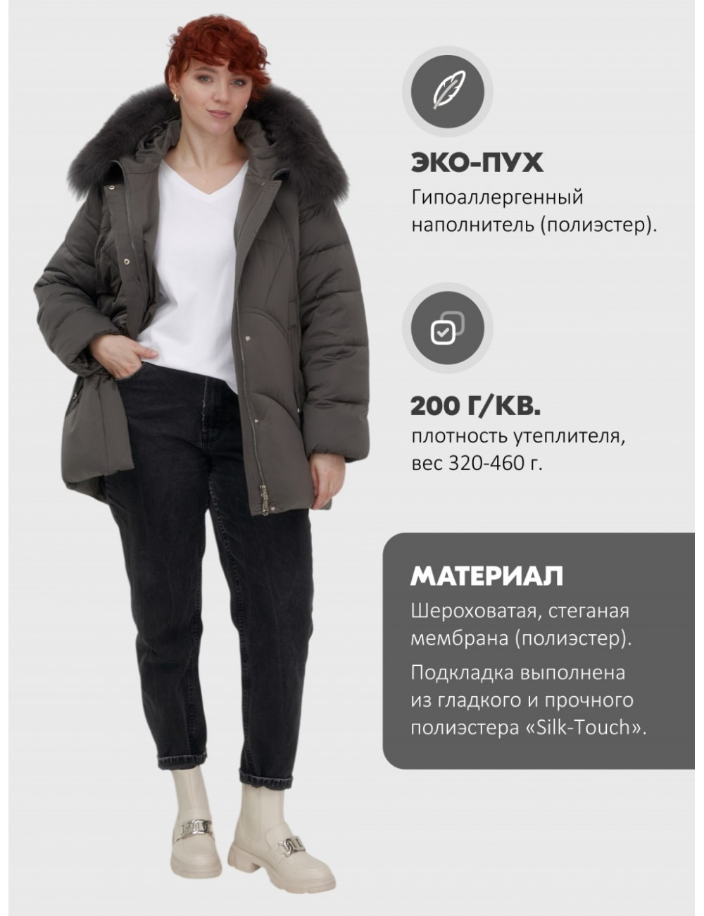 | Особенности модели | быстросохнущая, ветрозащита, водоотталкивающий материал, гипоаллергенный материал, дышащий материал, съемная опушка |