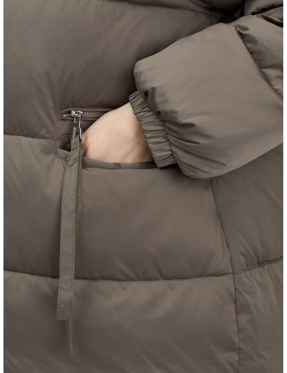 Пуховик представлен в четырёх актуальных оттенках 2025 года: глубоком чёрном, благородном коричневом, элегантном бежевом и загадочном тёмно-зелёном.