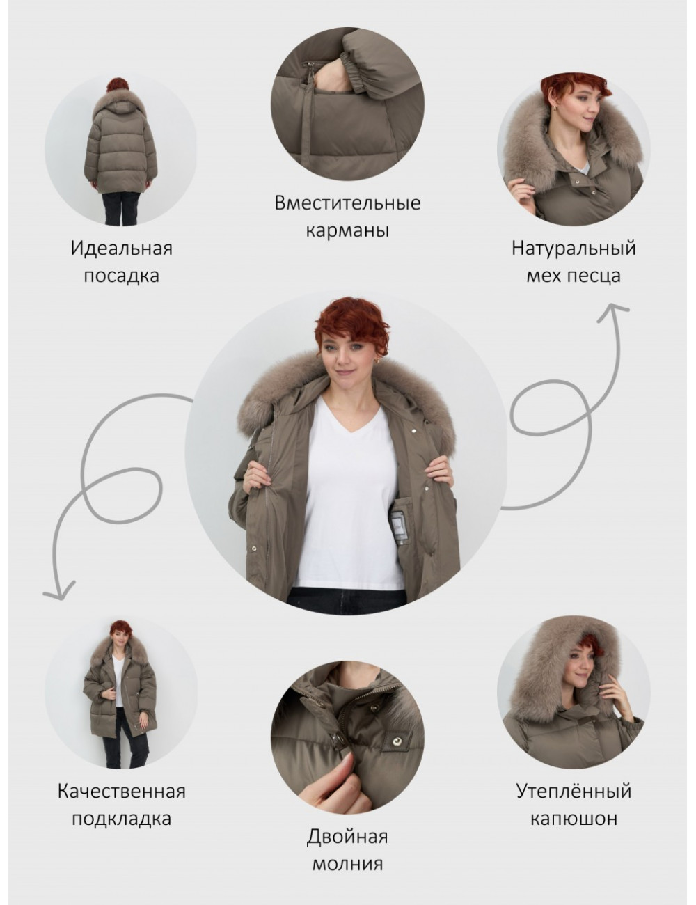 | Декоративные элементы | Капюшон, Манжеты, Карманы, Мех |