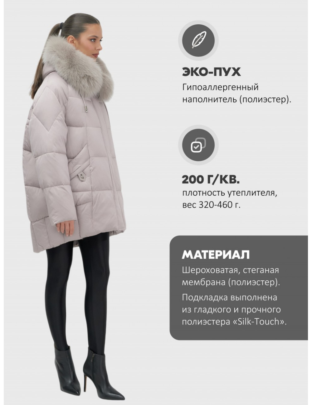 | Особенности модели | быстросохнущая, ветрозащита, водоотталкивающий материал, гипоаллергенный материал, дышащий материал, съемная опушка |
