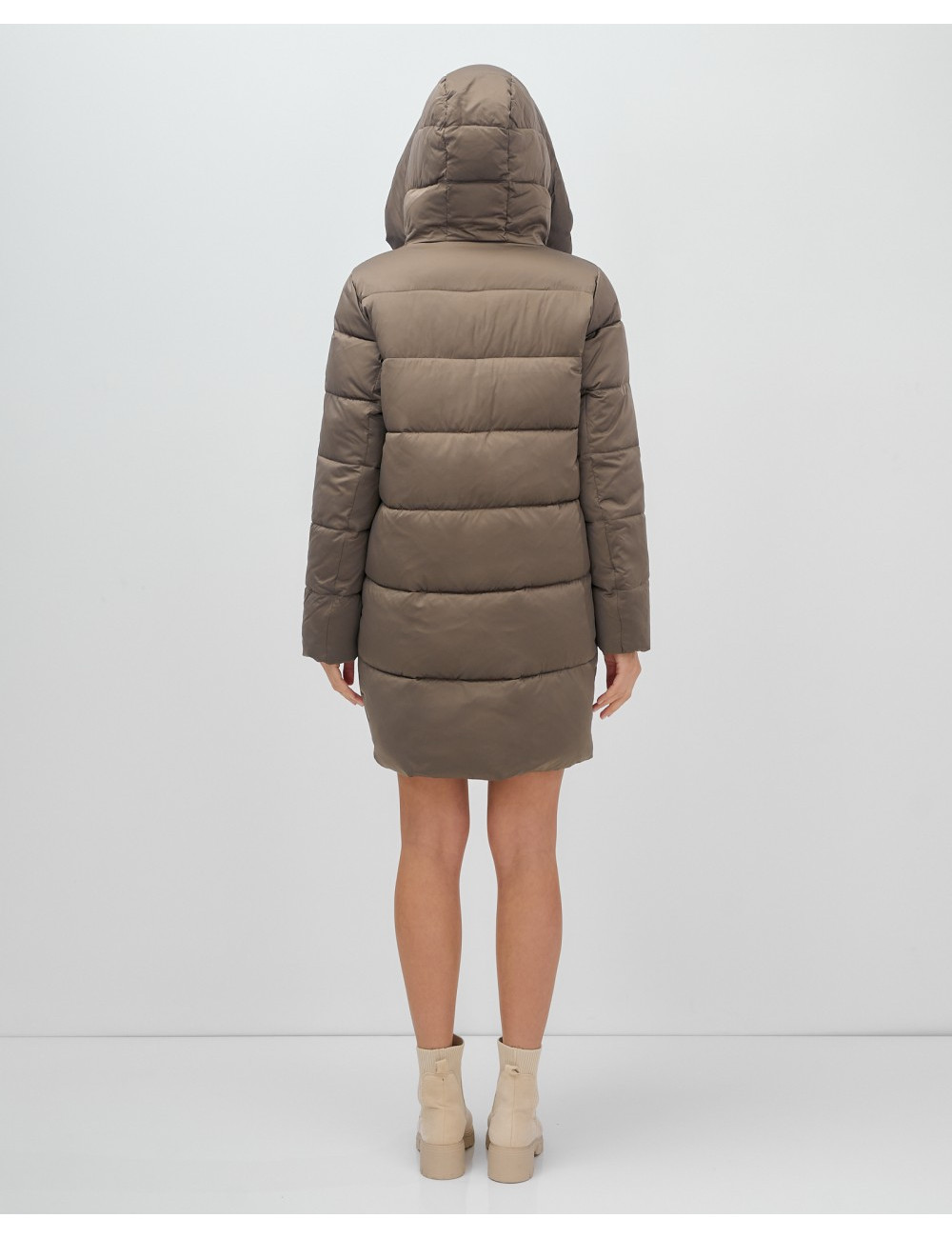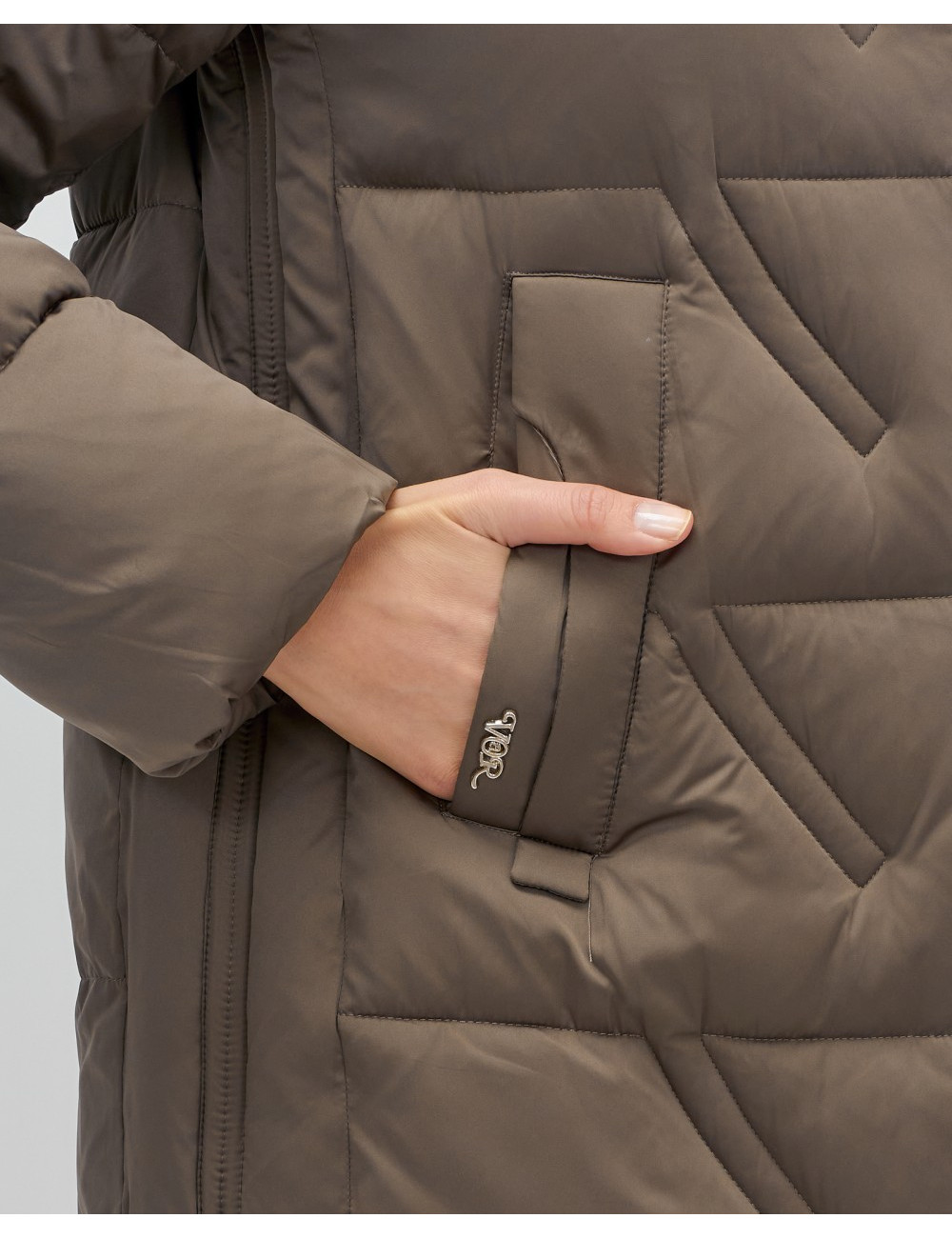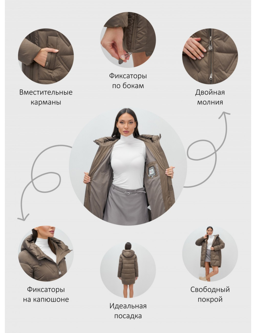 Пуховик имеет среднюю длину до колена, прямой и свободный крой, длинные рукава с манжетами и несъёмный капюшон. Внутренние швы проклеены и прошиты для защиты от ветра, а внутренние карманы и прорезные карманы на кнопках добавляют удобства.