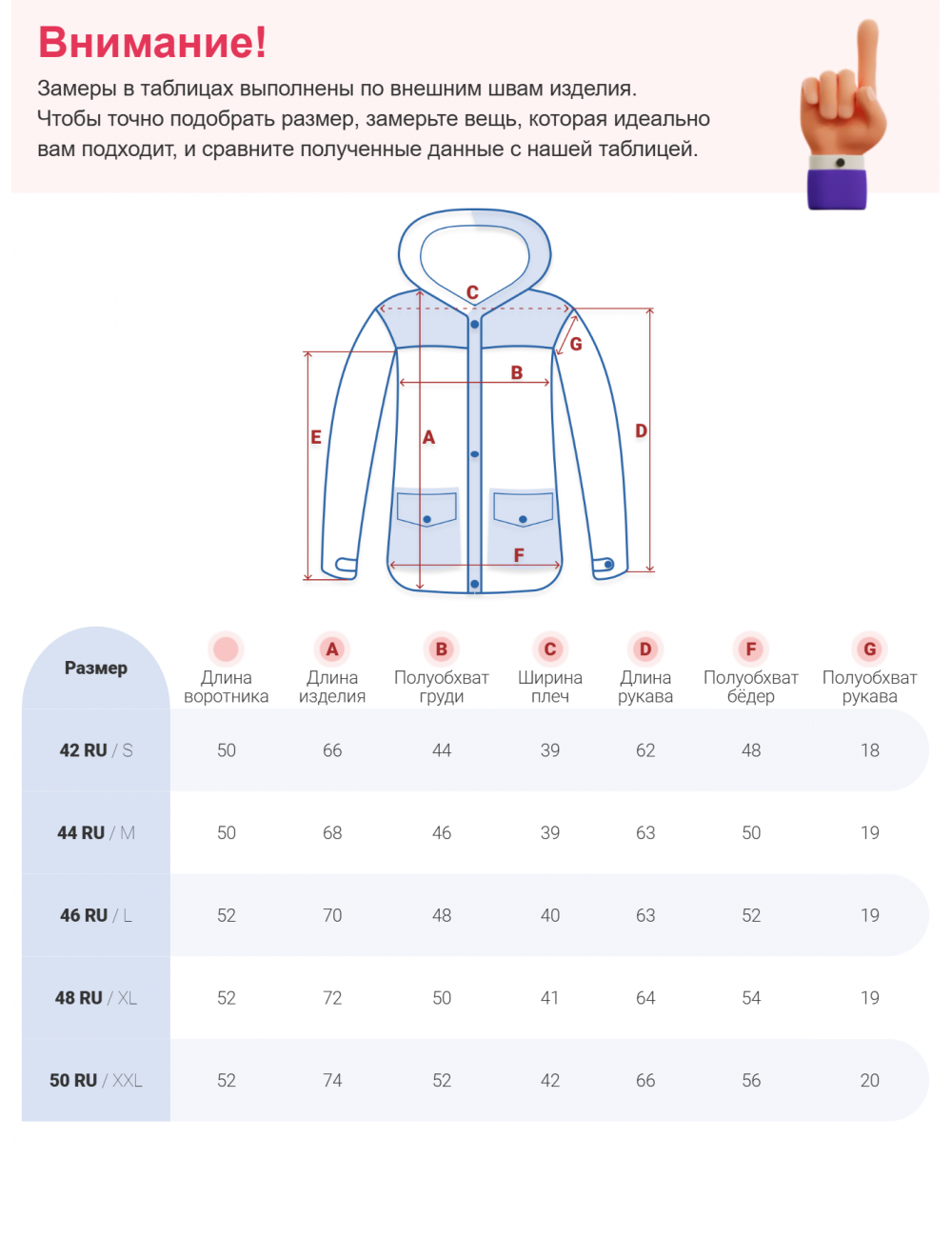 Мы рекомендуем вам измерить основные параметры, такие как длина куртки, длина рукава, полуобхват груди и другие, чтобы выбрать идеальный размер.