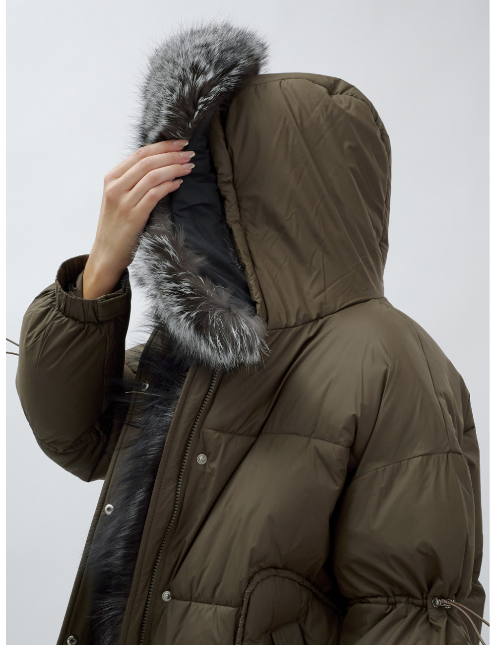 | Особенности модели | быстросохнущая, водоотталкивающий материал, гипоаллергенный материал, дышащий материал, съемная опушка, утягивающая модель |