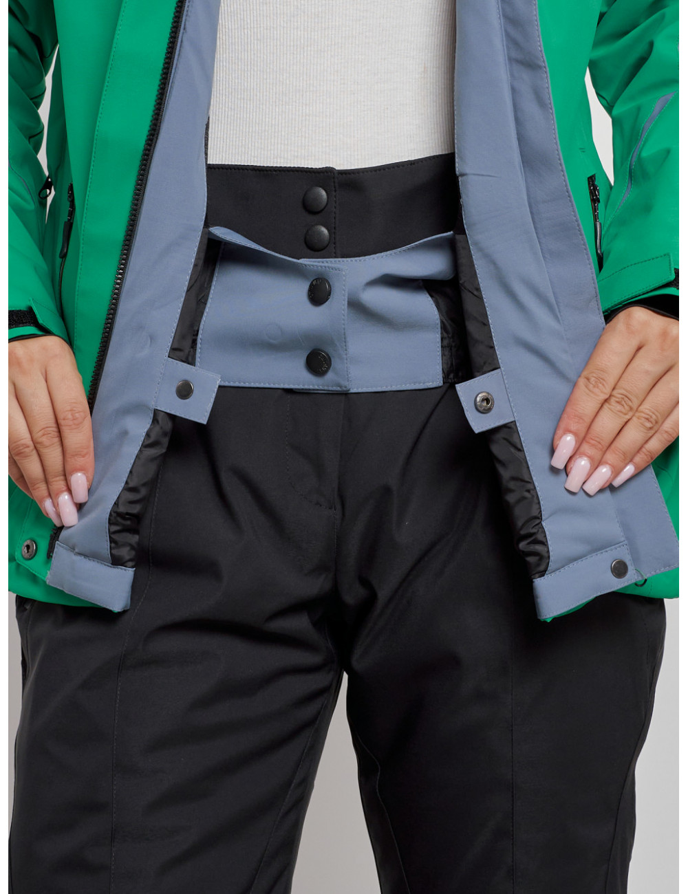 Костюм оснащён съёмным утеплённым капюшоном, эластичными манжетами на рукавах, ветрозащитной планкой и другими элементами, которые обеспечивают комфорт и защиту. Кроме того, он имеет вентиляционные отверстия, специальный карман для ски-пасса и карманы на влагостойкой молнии.