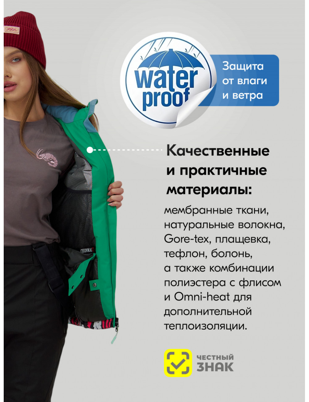 Мы используем высококачественные материалы, которые обеспечивают комфорт, тепло и защиту от непогоды. Утеплитель тинсулейт, водоотталкивающая пропитка и водонепроницаемая мембрана — всё это для вашего удобства и комфорта.