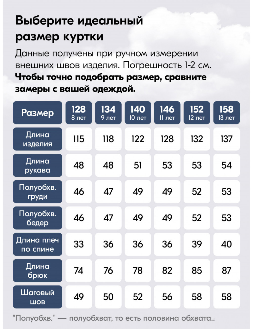 | Подростковый M (152) | 146 - 152 | 12 - 13 лет |
