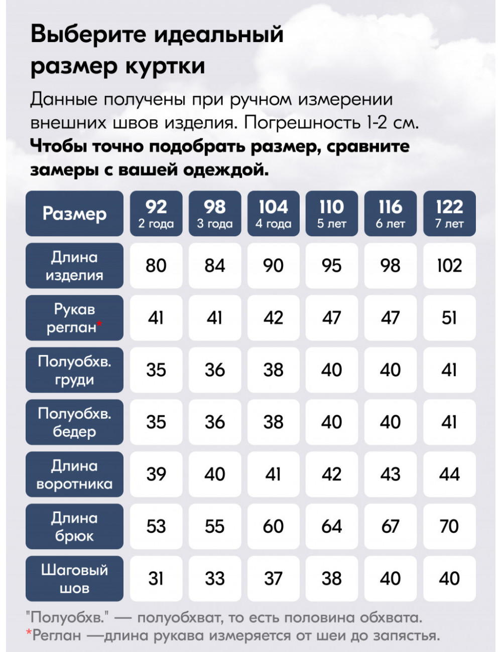 При выборе размера комбинезона рекомендуем измерить длину комбинезона, полуобхват груди, длину плеч по спине, длину рукава, внутренний шов рукава, полуобхват бёдер. Используйте сантиметровую ленту для точности.