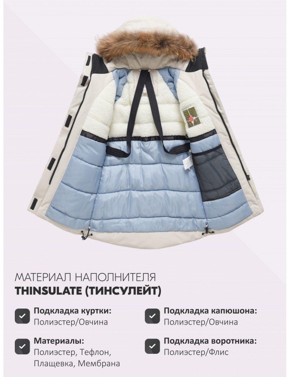 | Материал подкладки куртки | Полиэстер/Овчина |