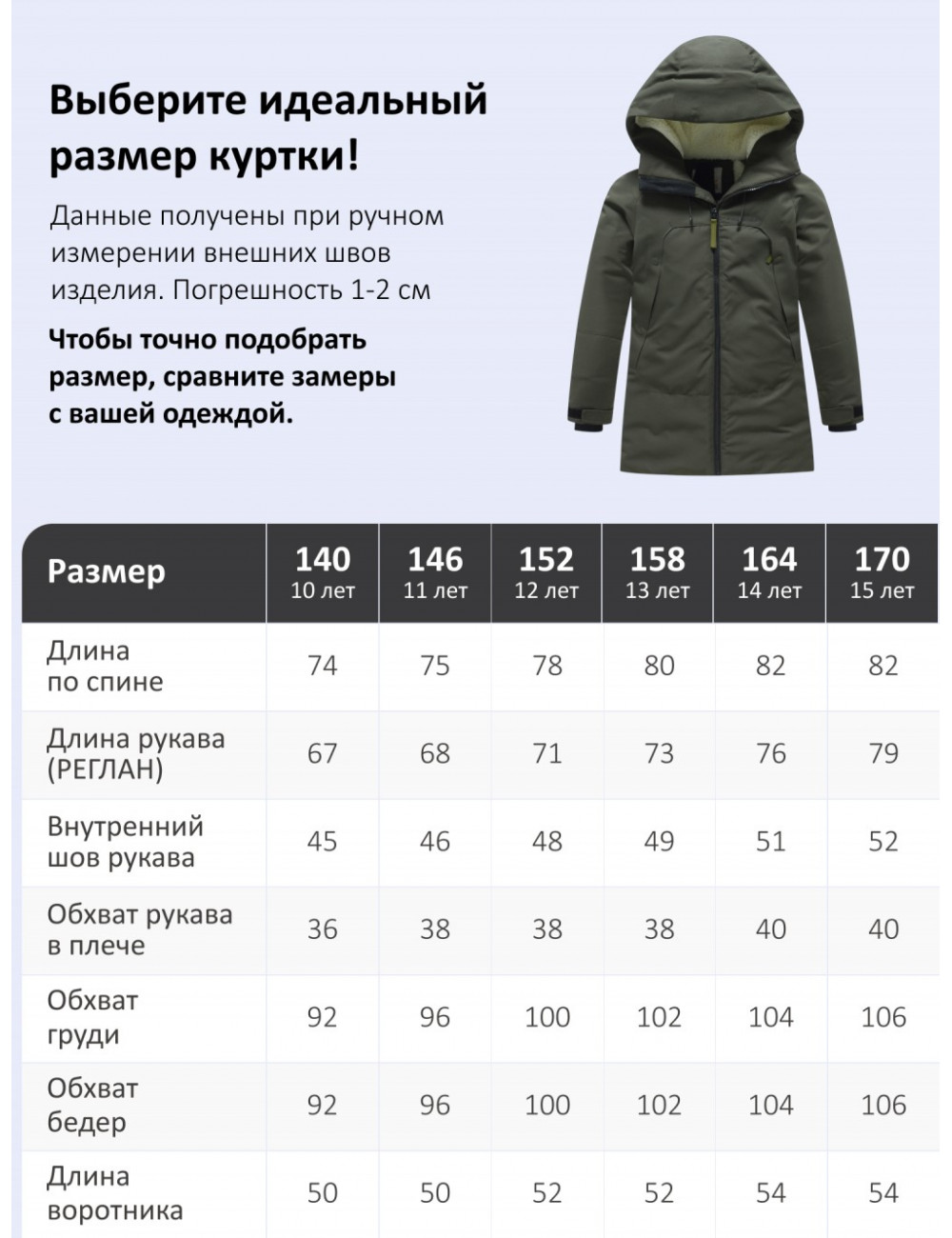 При выборе размера важно измерить длину куртки, длину рукава, внутренний шов рукава, обхват рукава в плече, обхват груди и обхват бёдер. Это поможет подобрать идеальную посадку. - Можно ли носить парку в помещении?
