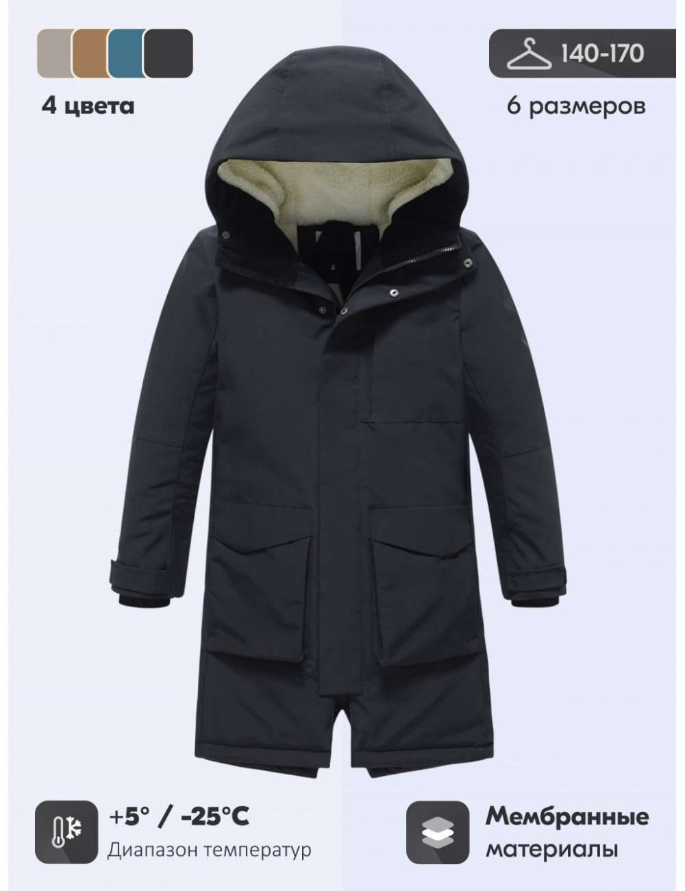 Эта парка представлена в стильных универсальных цветах — коричневом, тёмно-зелёном, чёрном и бежевом.