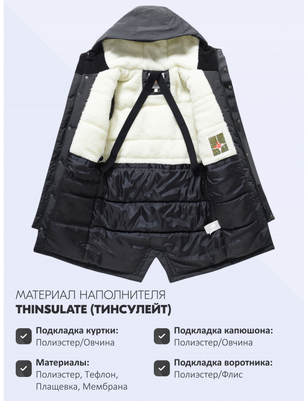 | Материал подкладки куртки | Полиэстер/Овчина |