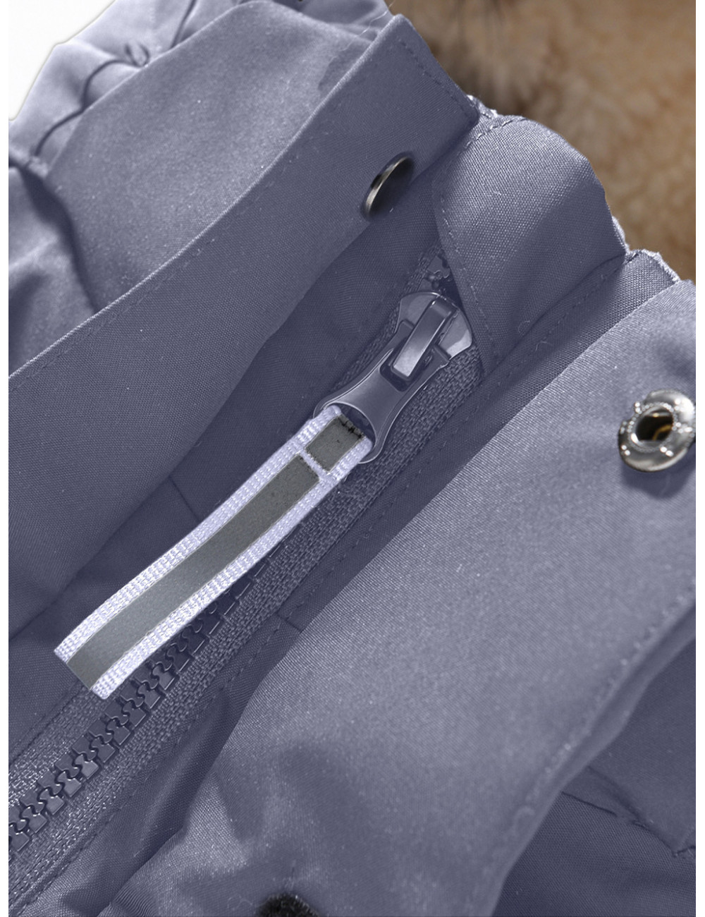 Натуральная опушка из меха добавляет стильный акцент и дополнительное тепло. Высокий воротник-стойка надёжно защищает от холода, а защита подбородка предотвращает раздражение кожи при закрытии молнии.
